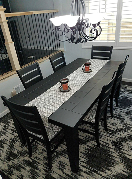 The table turned out absolutely BEAUTIFUL! The black matte finish was the perfect choice for our painted dining room table. I can’t wait to host the holidays at our home now so we can show off our refinished dining room table set! We added in an 8x10 rug just to pull the entire dining room together! Doesn’t it look beautiful?
