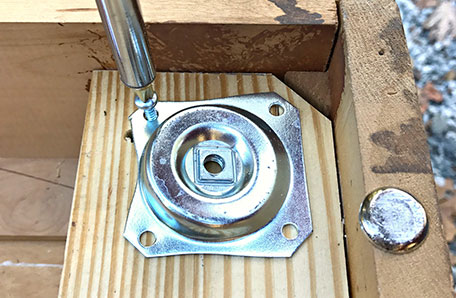 After the wood was attached with wood glue and screws, I screwed on the metal plates for the legs. Once all 4 plates were attached, the legs were ready to be attached. Before I could do that though, I had to prep and paint them. A quick sanding and 2 coats of the BEHR PREMIUM PLUS® Interior Eggshell Enamel in Sea Ice, and once they were dry, I screwed them into the metal plates.