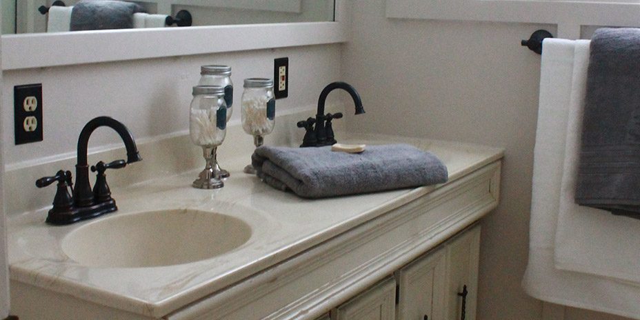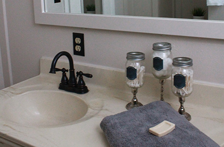 To begin, I had to prep the wall. First step was to scrub away all the mildew. Once the wall was dried, using painter’s tape, I taped along all the surfaces that weren’t going to be painted, like the vanity. I also removed the outlet plates, switch covers and towel holders.