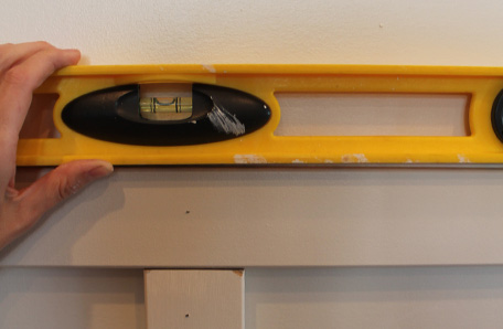 Next is to decide where you want the vertical slats. Measure from the top of the base molding up to the bottom of the horizontal molding. Make your cut and then secure with either liquid nails or a nail gun if it’s in a stud. Use the level to make sure it is level.