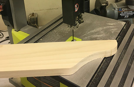 To build this bookshelf, we started by cutting all the wood with a miter saw to the dimensions specified in the project plans. The profile at the top can be cut out with a jig saw or band saw using the supplied template. The notch at the bottom will also need to be cut out to allow the bookshelf to fit around the existing trim. I also added a curve to the bottom rail of each shelf for added detail. This can be traced using anything stiff and straight that you can find and flex to create the arc.
