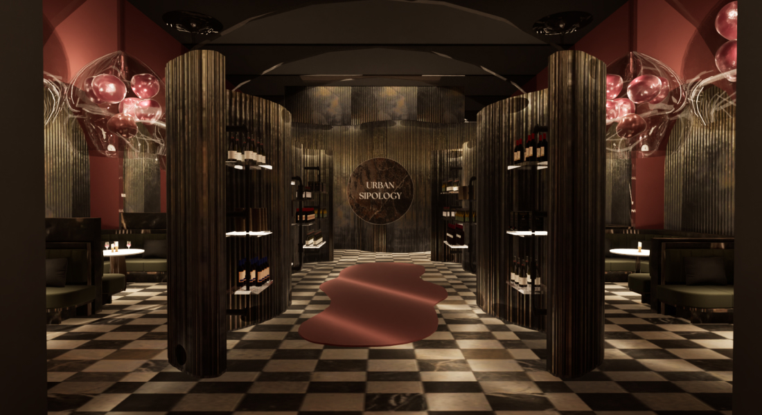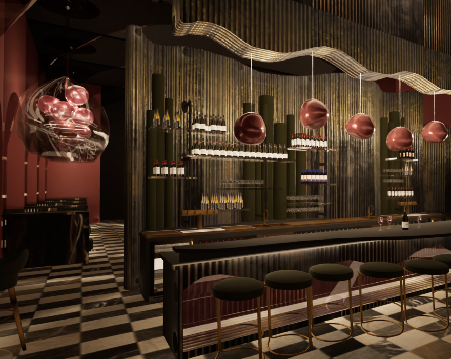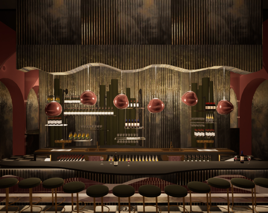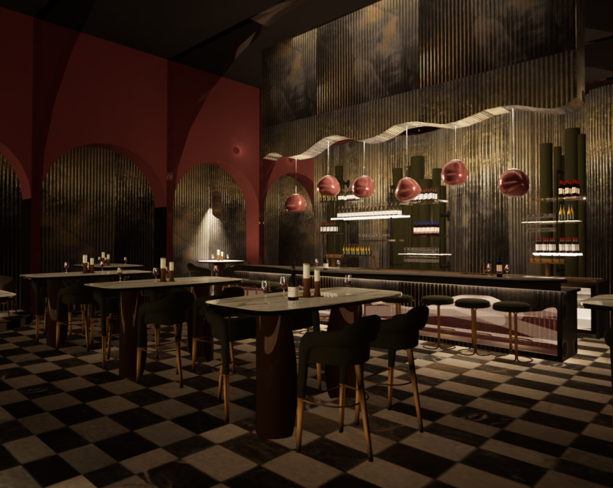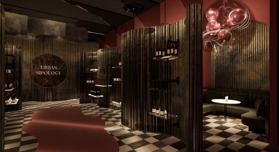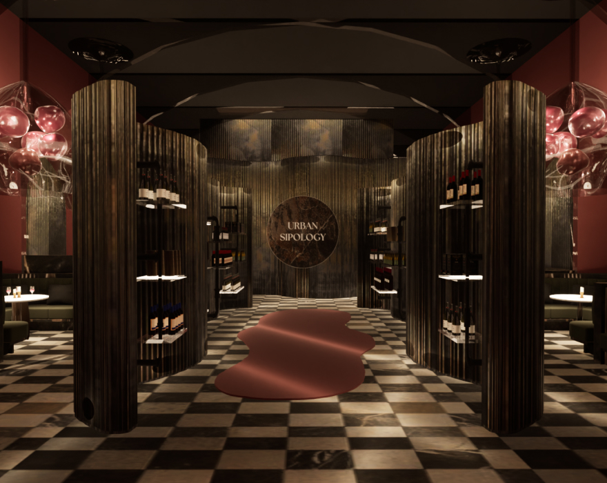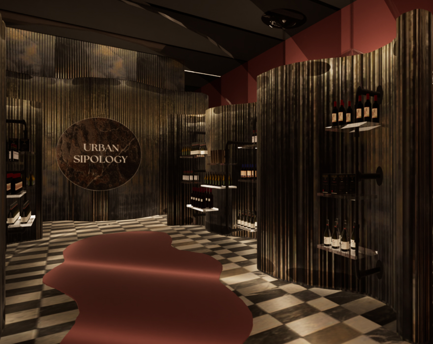 From Grapes to Glass: Urban Sipology redefines the wine tasting experience in the heart of Chicago, where the city’s industrial legacy merges seamlessly with a refined, contemporary aesthetic crafted for today’s vibrant, youthful audience. This innovative venue reimagines tradition, infusing the wine tasting atmosphere with Chicago’s dynamic energy while catering to diverse, modern tastes. A warm, sophisticated color palette features oxidized steel, earthy leather, and bronzed metals, accentuated by ambient lighting that creates an inviting, immersive, and educational environment. Embracing the fluidity of wine, the design subtly references the journey from grape to glass, incorporating elements inspired by the winemaking process- filtration, flow, and bottling- to evoke a sense of graceful movement. This approach shapes an engaging, kinetic environment, mirroring the elegance and progression intrinsic to the world of wine. Behr’s Rumors MQ1-15 provides a sultry and sophisticated energy, conveying warmth and is a powerful statement perfect for a wine venue. Urban Sipology offers a trendy, inclusive space for memorable wine tasting experiences, featuring an extensive wine display, a small retail area, a casual tasting bar, private nooks, and a seasonal patio- all set to soft background music. With a modern design tailored for younger audiences, it makes this the perfect place to gather with friends after work. The conceptual inspiration for Urban Sipology’s design draws from the elegant form of a wine glass. Just as the narrow stem of the glass supports the bowl full of rich wine, the layout of Urban Sipology begins with a focused, intimate retail corridor. This hallway acts as a preview, guiding guests through a subtle, narrowing space that hints at the lively atmosphere awaiting around the corner. As they emerge from the corridor, visitors are welcomed into an expansive, vibrant tasting area that mirrors the fullness and pleasure of savoring each sip of wine. This intentional progression invites patrons to explore and experience the space gradually, echoing the experience of wine tasting itself- starting with anticipation, building with discovery, and culminating in enjoyment.
