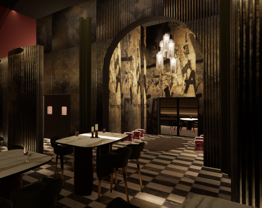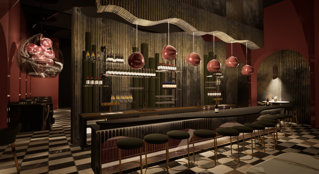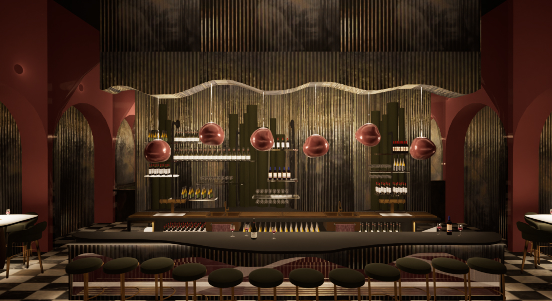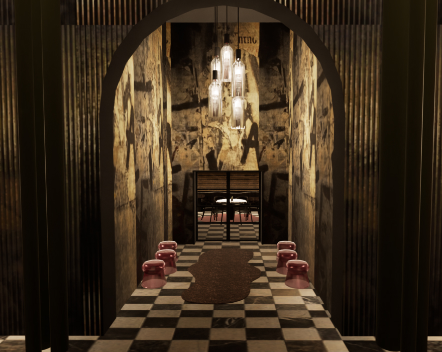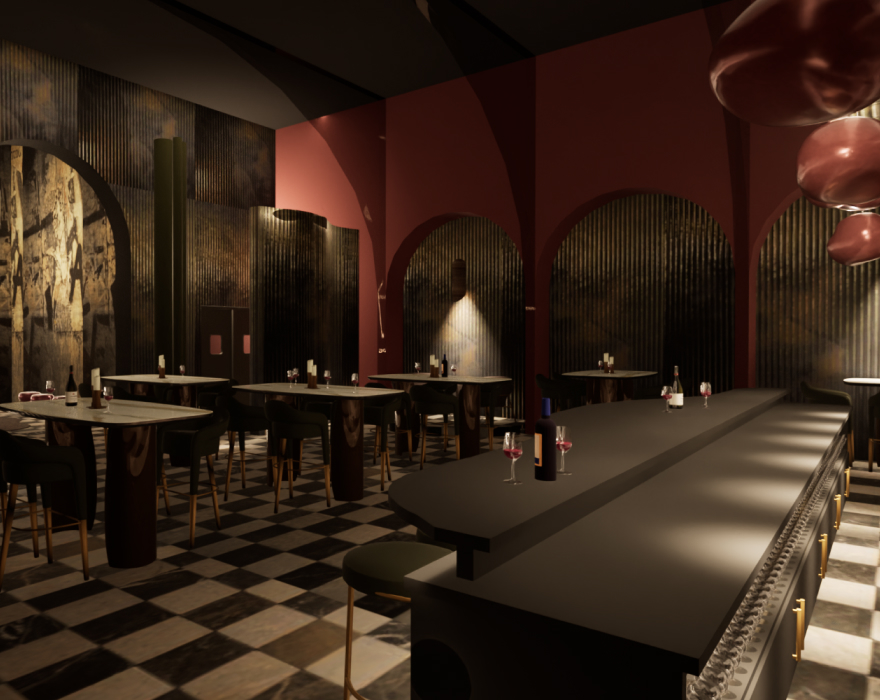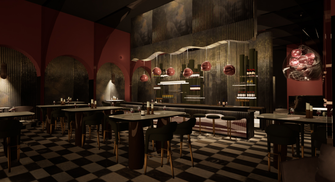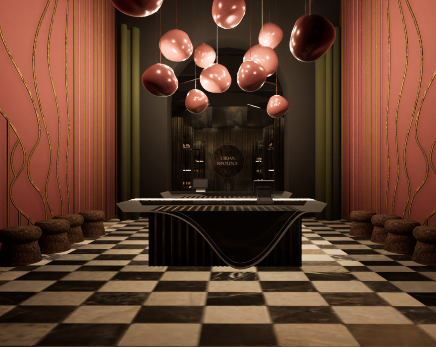 From Grapes to Glass: Urban Sipology redefines the wine tasting experience in the heart of Chicago, where the city’s industrial legacy merges seamlessly with a refined, contemporary aesthetic crafted for today’s vibrant, youthful audience. This innovative venue reimagines tradition, infusing the wine tasting atmosphere with Chicago’s dynamic energy while catering to diverse, modern tastes. A warm, sophisticated color palette features oxidized steel, earthy leather, and bronzed metals, accentuated by ambient lighting that creates an inviting, immersive, and educational environment. Embracing the fluidity of wine, the design subtly references the journey from grape to glass, incorporating elements inspired by the winemaking process- filtration, flow, and bottling- to evoke a sense of graceful movement. This approach shapes an engaging, kinetic environment, mirroring the elegance and progression intrinsic to the world of wine. Behr’s Rumors MQ1-15 provides a sultry and sophisticated energy, conveying warmth and is a powerful statement perfect for a wine venue. Urban Sipology offers a trendy, inclusive space for memorable wine tasting experiences, featuring an extensive wine display, a small retail area, a casual tasting bar, private nooks, and a seasonal patio- all set to soft background music. With a modern design tailored for younger audiences, it makes this the perfect place to gather with friends after work. The conceptual inspiration for Urban Sipology’s design draws from the elegant form of a wine glass. Just as the narrow stem of the glass supports the bowl full of rich wine, the layout of Urban Sipology begins with a focused, intimate retail corridor. This hallway acts as a preview, guiding guests through a subtle, narrowing space that hints at the lively atmosphere awaiting around the corner. As they emerge from the corridor, visitors are welcomed into an expansive, vibrant tasting area that mirrors the fullness and pleasure of savoring each sip of wine. This intentional progression invites patrons to explore and experience the space gradually, echoing the experience of wine tasting itself- starting with anticipation, building with discovery, and culminating in enjoyment.