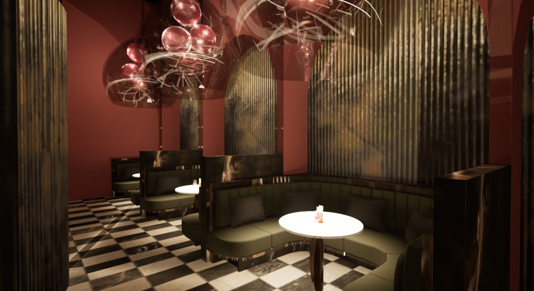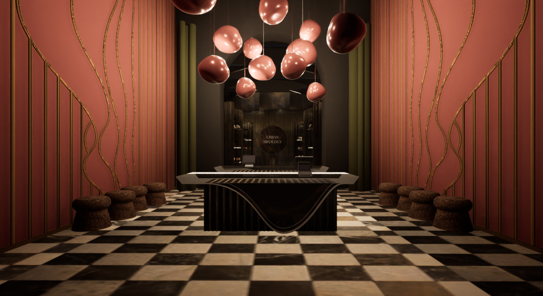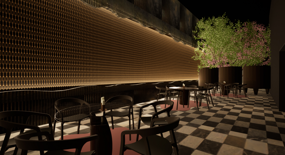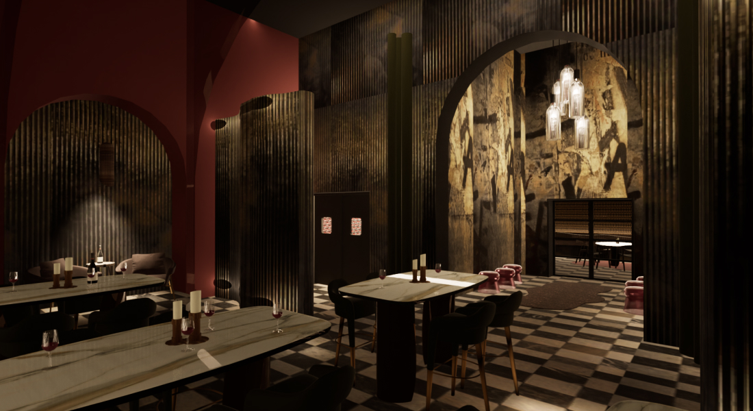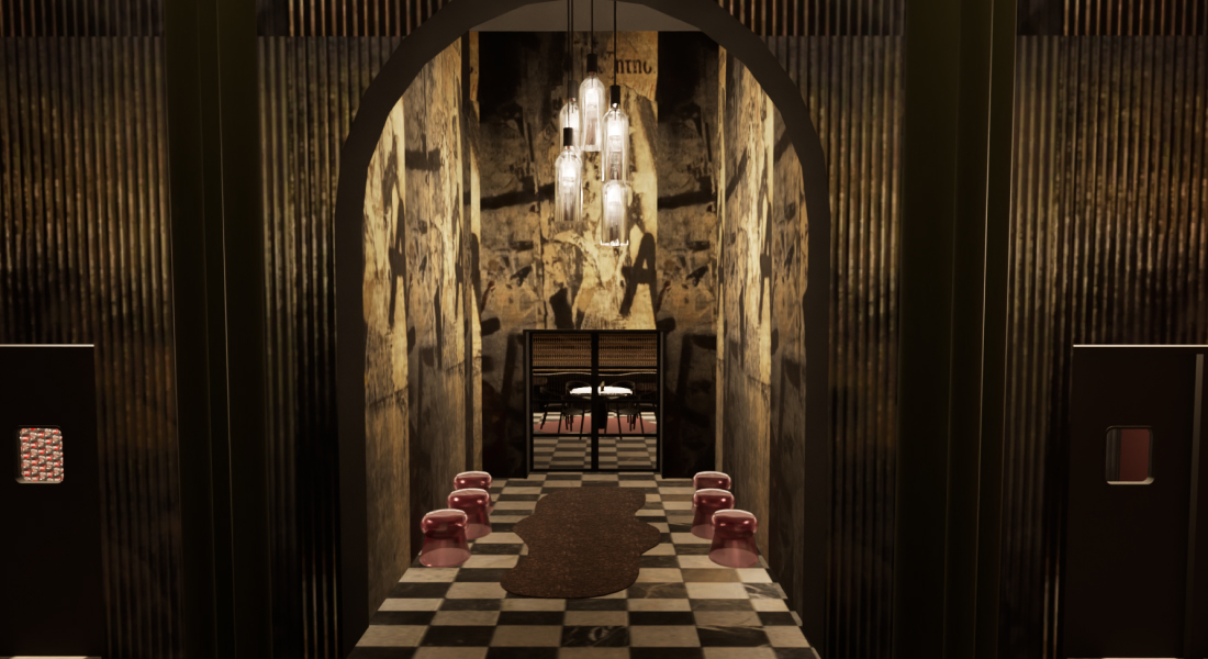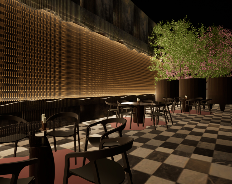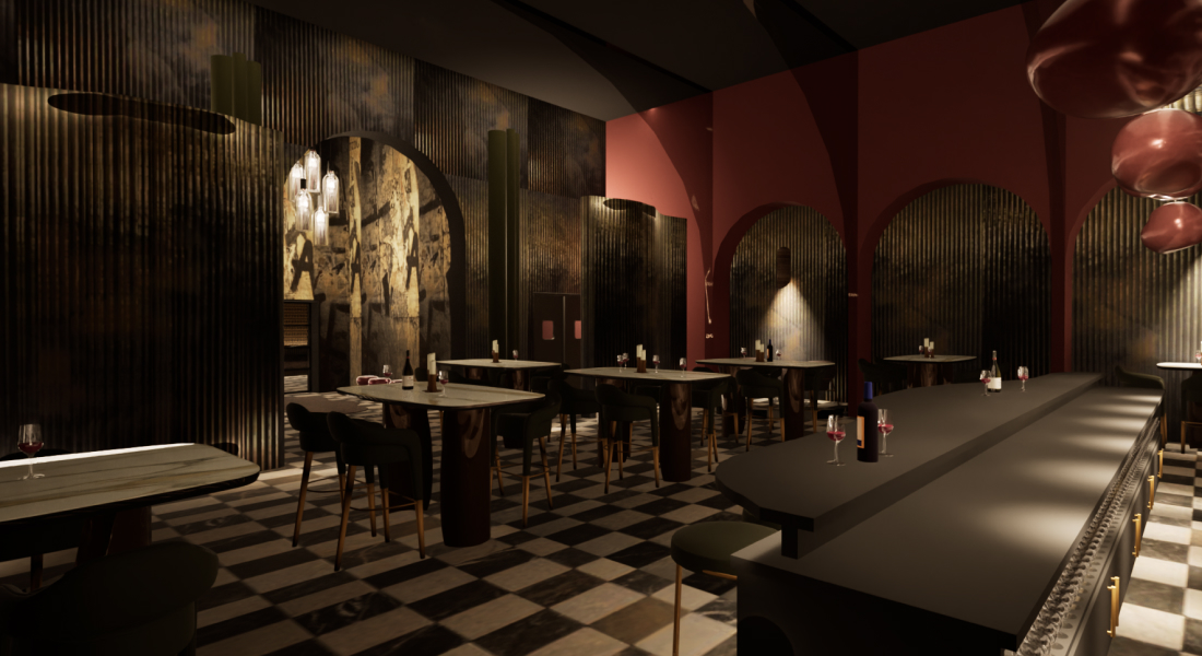 From Grapes to Glass: Urban Sipology redefines the wine tasting experience in the heart of Chicago, where the city’s industrial legacy merges seamlessly with a refined, contemporary aesthetic crafted for today’s vibrant, youthful audience. This innovative venue reimagines tradition, infusing the wine tasting atmosphere with Chicago’s dynamic energy while catering to diverse, modern tastes. A warm, sophisticated color palette features oxidized steel, earthy leather, and bronzed metals, accentuated by ambient lighting that creates an inviting, immersive, and educational environment. Embracing the fluidity of wine, the design subtly references the journey from grape to glass, incorporating elements inspired by the winemaking process- filtration, flow, and bottling- to evoke a sense of graceful movement. This approach shapes an engaging, kinetic environment, mirroring the elegance and progression intrinsic to the world of wine. Behr’s Rumors MQ1-15 provides a sultry and sophisticated energy, conveying warmth and is a powerful statement perfect for a wine venue. Urban Sipology offers a trendy, inclusive space for memorable wine tasting experiences, featuring an extensive wine display, a small retail area, a casual tasting bar, private nooks, and a seasonal patio- all set to soft background music. With a modern design tailored for younger audiences, it makes this the perfect place to gather with friends after work. The conceptual inspiration for Urban Sipology’s design draws from the elegant form of a wine glass. Just as the narrow stem of the glass supports the bowl full of rich wine, the layout of Urban Sipology begins with a focused, intimate retail corridor. This hallway acts as a preview, guiding guests through a subtle, narrowing space that hints at the lively atmosphere awaiting around the corner. As they emerge from the corridor, visitors are welcomed into an expansive, vibrant tasting area that mirrors the fullness and pleasure of savoring each sip of wine. This intentional progression invites patrons to explore and experience the space gradually, echoing the experience of wine tasting itself- starting with anticipation, building with discovery, and culminating in enjoyment.