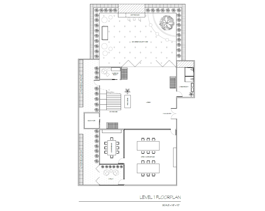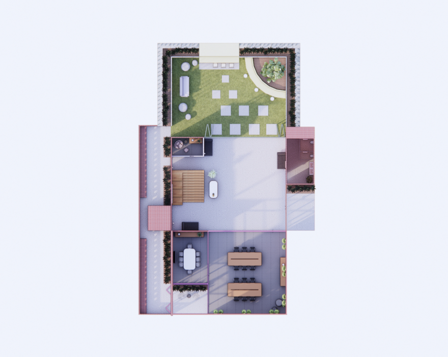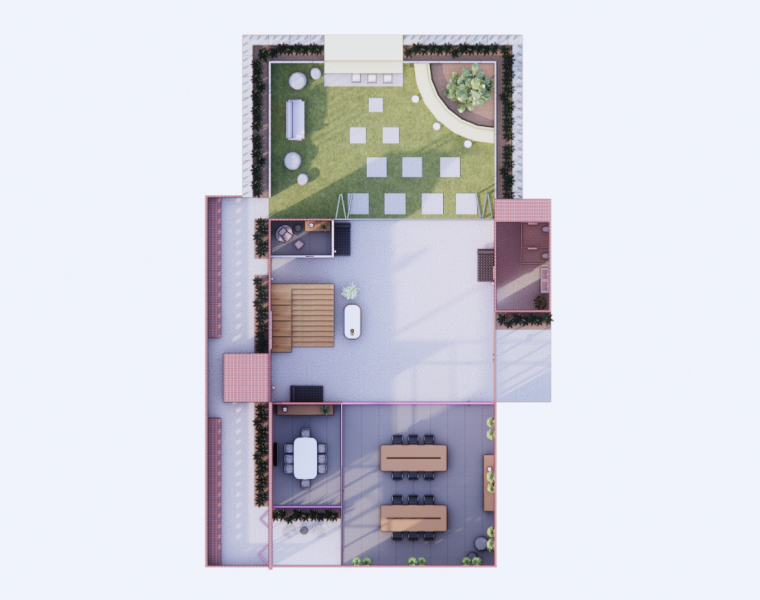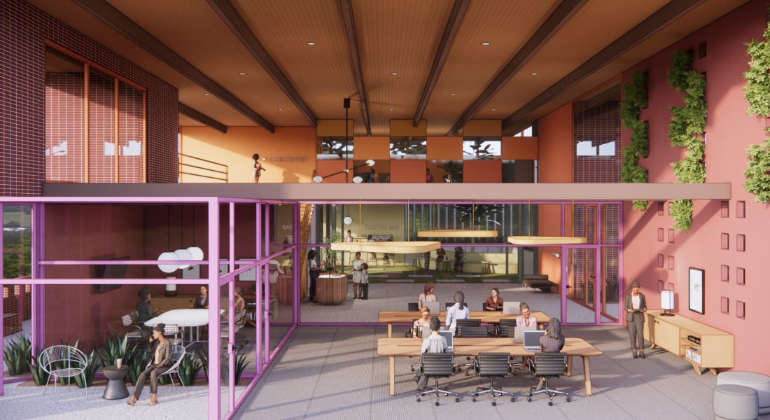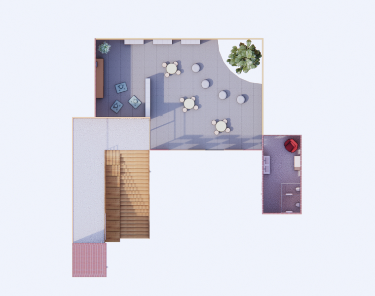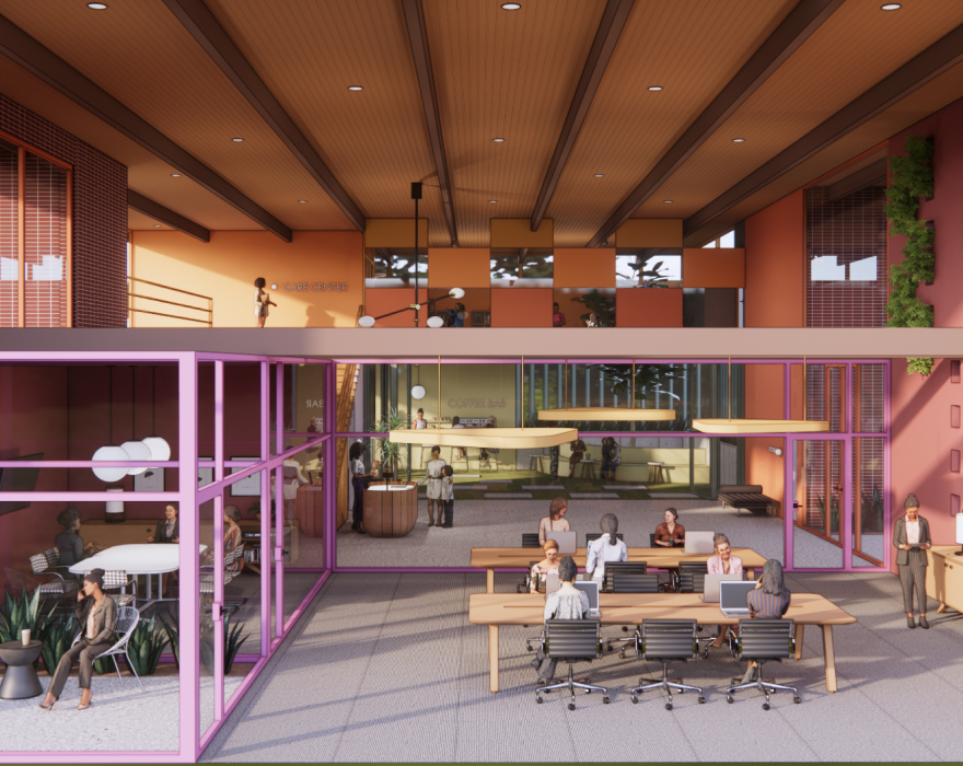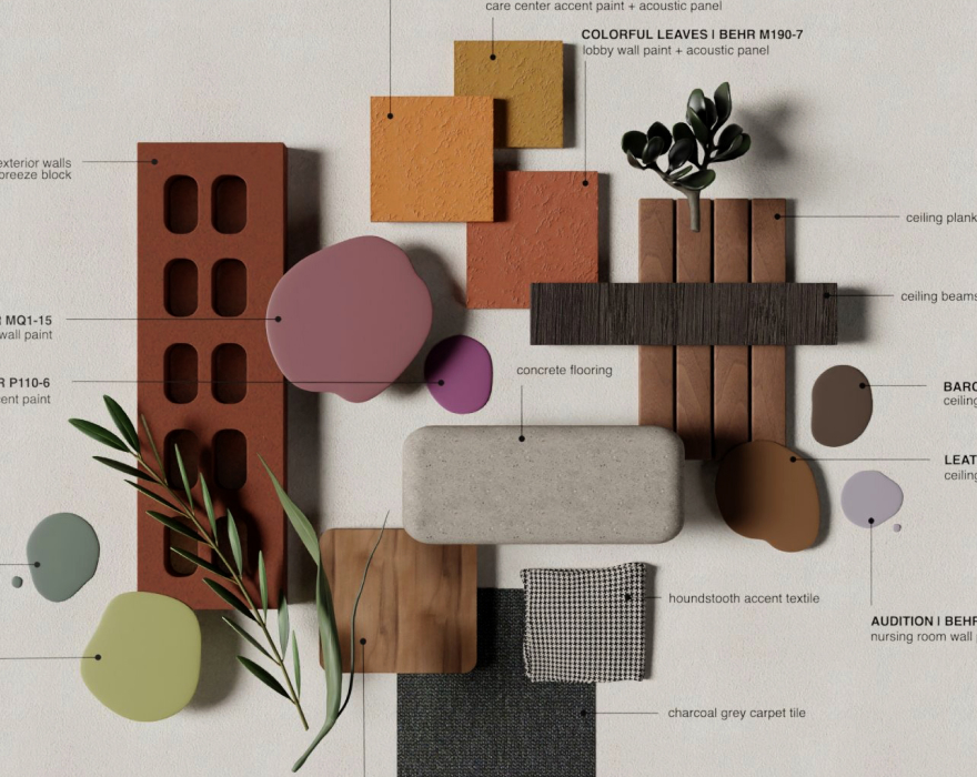 BOUNDLESS is a women’s work and play center that fuses work, childcare and social settings into one modern, multi-functional space. Taking thoughtful inspiration from Behr’s design theme, "No Clear Boundaries", the concept of BOUNDLESS was created to remove traditional confines of women’s lives, where they have to keep work, motherhood and a social life separated, instead allowing them to coexist in a space where working women and moms can be productive, supported and fulfilled. The word "boundless" is defined as unlimited or immense, and that is what this design was created for women to be. Answering the call to create something timeless and modern, the design was led with a mid-century modern influence, a style that has lasted the test of time and is ever more relevant today. Design elements that honor the style include floor to ceiling and clerestory windows, fluidity between indoors and outdoors, raw materials and color blocking. Distinguished by open floor plans and sight lines, this style implores BOUNDLESS to utilize color to define spaces where there are otherwise "no clear boundaries". Additionally, the openness in the structure brings the concept to fruition by achieving its goal to blur the boundaries of women's lives. Movement between the indoors and outdoors allows occupants to carry conversations and relationships, professional and personal, throughout the space, as well as offering mental clarity with direct access to nature. Also, the key is the open sight lines between the first floor and second floor. There are acoustic and visual boundaries built into the design so that both spaces may function optimally, but just enough visual space was left to give mothers peace of mind that their children are being cared for, so that they may be productive in work without feeling isolated from their children. With color paramount to the design, a palette was curated in timeless earth tones with bold saturation for a modern touch. Rumors MQ1-15 was prioritized in the workspace, for its mood and sophistication to create a feeling of intimacy for focused work, with Wild Berry P110-6 adding a pop of femininity and playfulness to this non-traditional office. Colorful Leaves M190-7, Flaming Torch PPU3-03 and Wild Ginger M270-7 create an ascending transition, while Boreal N420-5 and Fresh Artichoke M340-5 work in synergy with the outdoor courtyard. Audition MQ5-36 calms the interior of the nursing room, and Baronial Brown N170-7 and Leather Work S240-7 coat the post and beam ceiling, all together bringing BOUNDLESS to life.