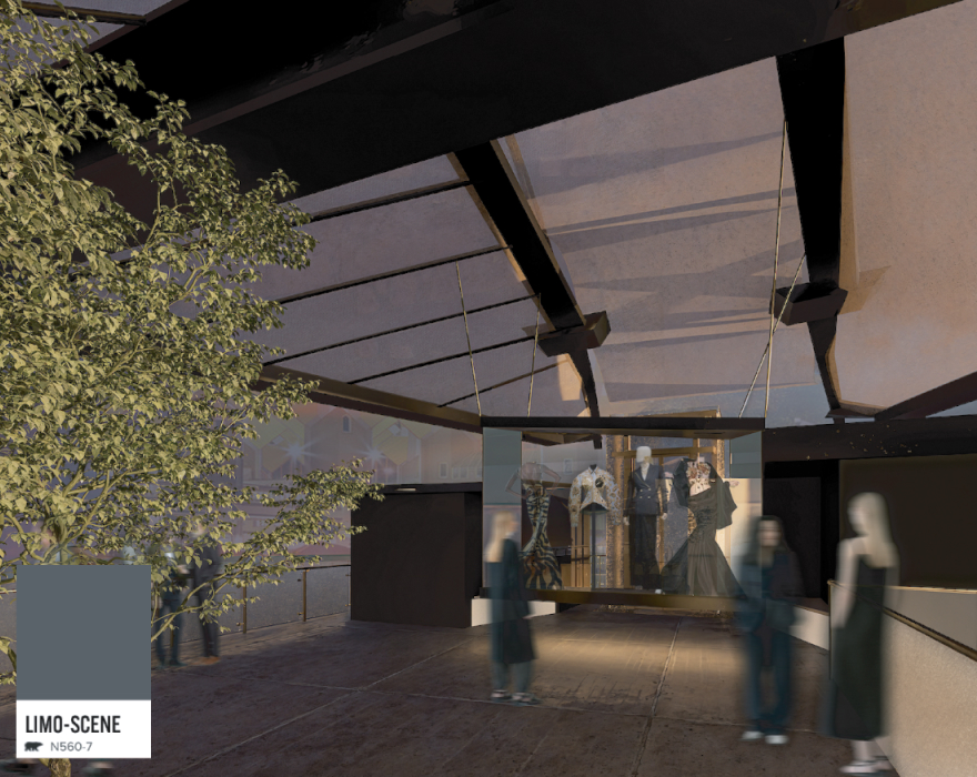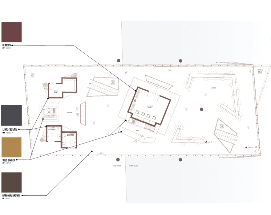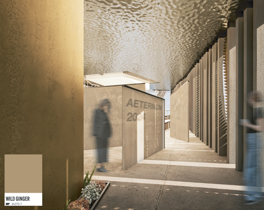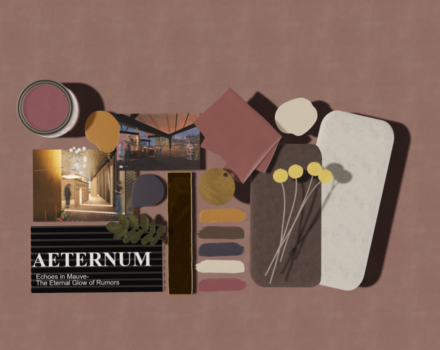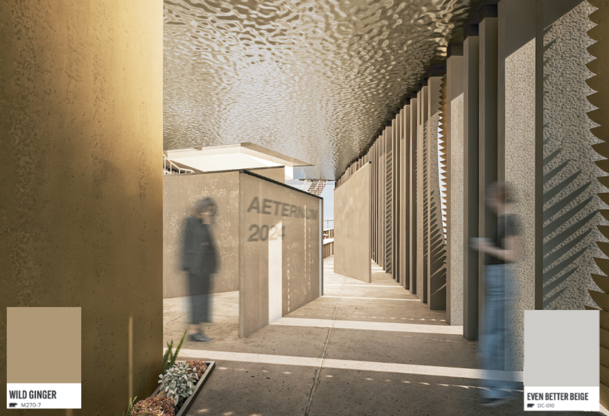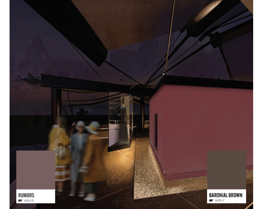 With the forecasted "fashionable" colors of the BEHR 2025 Commercial Color Forecast, the Schiaparelli-inspired fashion pavilion in Rotterdam comes alive as the sun begins to set, with its program designed to transform in tandem with the fading light. As dusk approaches, the pavilion’s central structure, painted in Behr’s 2025 Color of the Year: Rumors MQ1-15, starts to glow, echoing the rich, muted hues of a Rotterdam sunset. This deep, alluring mauve becomes a living reflection of the sunset’s tones, paying homage to the natural beauty of the site and enhancing the pavilion’s presence. Rumors MQ1-15 is more than a color; it is the heart of the pavilion, acting as a beacon that draws visitors in, creating a warm, inviting atmosphere as the day transitions to night. The paint's deep allure intensifies under the shifting light, interacting with the reflective metallic surfaces and kinetic elements to create a dynamic, ever-changing interplay of color and shadow. This transformation mirrors the sense of rebirth and transformation inherent in both the fashion inspiration and the Rotterdam skyline. Surrounding the vertical circulation, Behr’s Wild Ginger M270-7 adds depth and a sense of richness, framing movement through the space with warm, earthy undertones that complement the central glow. As visitors move through the pavilion, the flooring in Behr’s Baronial Brown N170-7 serves as an anchoring foundation, grounding the design in a sense of stability and connection to the earth. This deep, robust tone contrasts beautifully with the surrounding hues, adding a layer of warmth and timelessness to the overall experience. Behr’s Even Better Beige DC-010, used on the pavilion’s supportive skin structure, provides a soft, neutral backdrop that allows the more vibrant colors to shine. It adds a sense of lightness and balance, enhancing the pavilion’s skeletal details while offering moments of calm within the dynamic environment. Finally, Behr’s Limo-scene N560-7, a sleek, modern tone, is introduced to highlight certain architectural elements, acting as an accent that adds a subtle coolness to the pavilion’s design. It complements the warmer hues, creating a visual rhythm that enhances the pavilion’s layered experience. Together, these colors transform the pavilion into a cohesive, living organism that shifts with the changing light, creating a vibrant and harmonious interplay that honors the themes of rebirth, transformation, and layered experiences. This carefully orchestrated palette elevates the pavilion from a mere structure to an evolving masterpiece that embodies the essence of fashion, architecture, and the Rotterdam landscape.