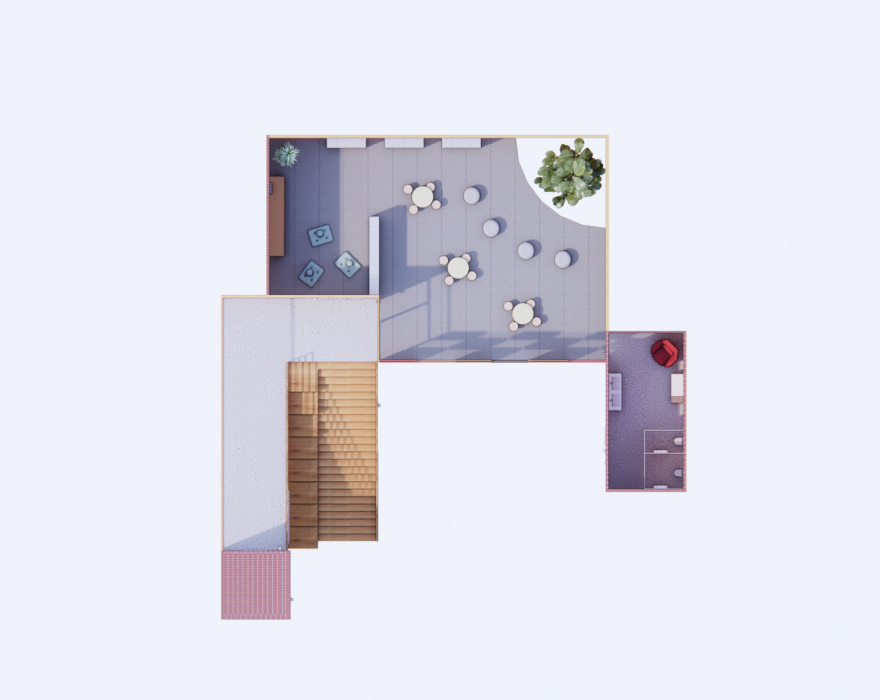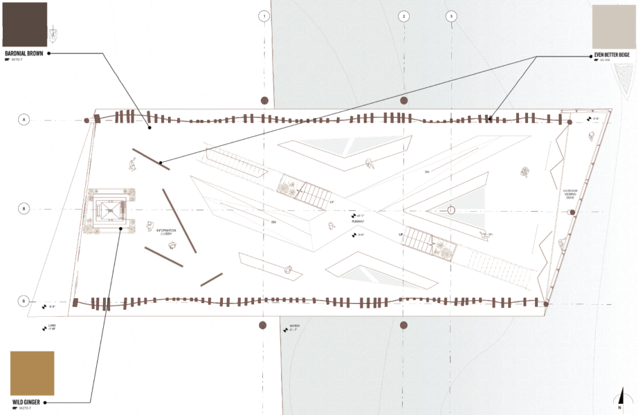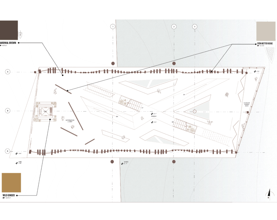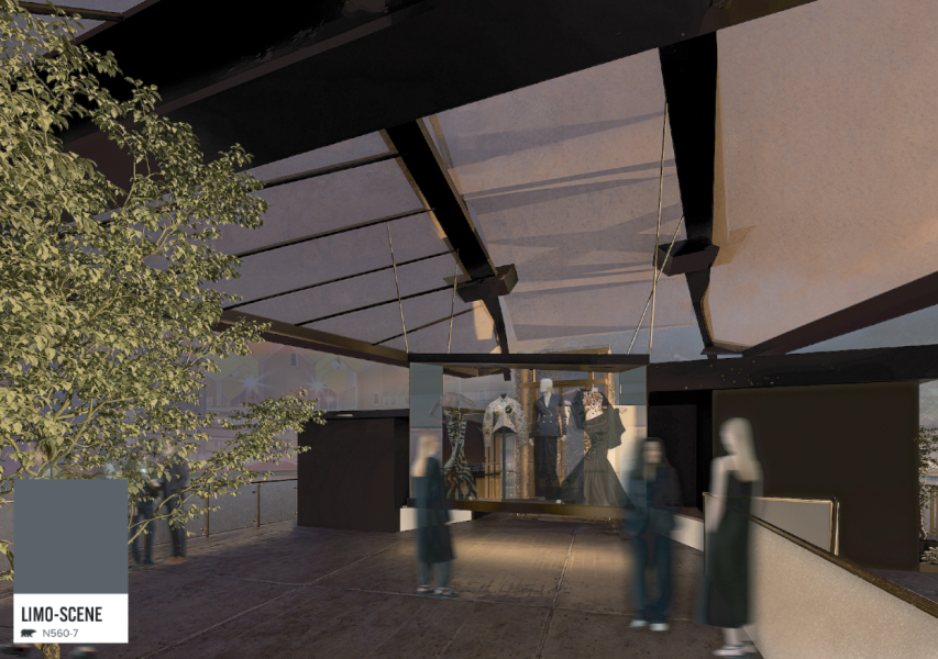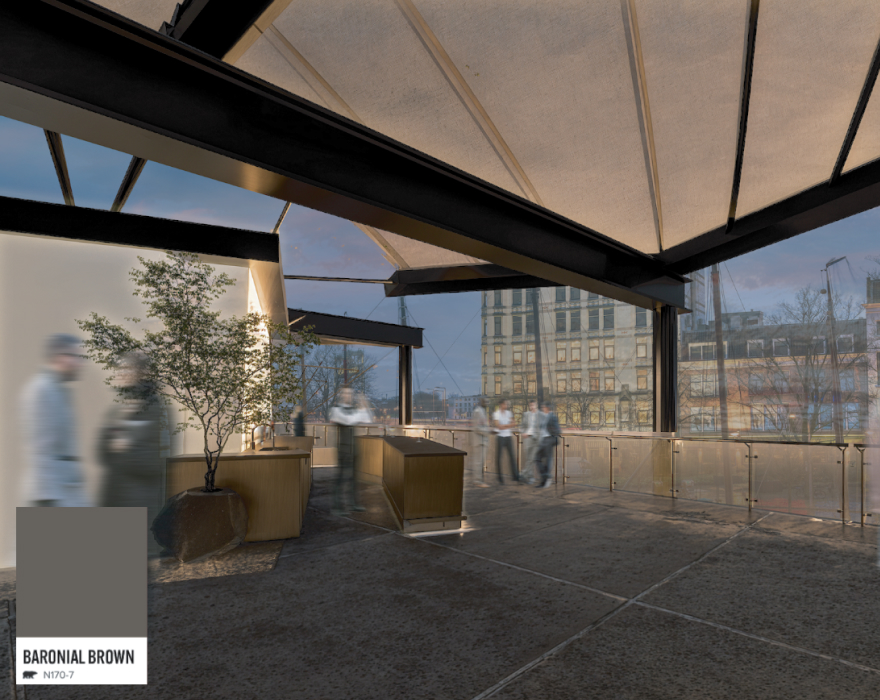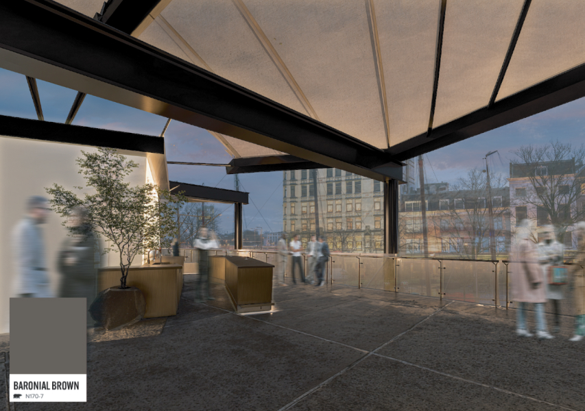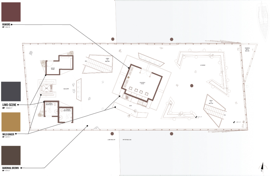 With the forecasted "fashionable" colors of the BEHR 2025 Commercial Color Forecast, the Schiaparelli-inspired fashion pavilion in Rotterdam comes alive as the sun begins to set, with its program designed to transform in tandem with the fading light. As dusk approaches, the pavilion’s central structure, painted in Behr’s 2025 Color of the Year: Rumors MQ1-15, starts to glow, echoing the rich, muted hues of a Rotterdam sunset. This deep, alluring mauve becomes a living reflection of the sunset’s tones, paying homage to the natural beauty of the site and enhancing the pavilion’s presence. Rumors MQ1-15 is more than a color; it is the heart of the pavilion, acting as a beacon that draws visitors in, creating a warm, inviting atmosphere as the day transitions to night. The paint's deep allure intensifies under the shifting light, interacting with the reflective metallic surfaces and kinetic elements to create a dynamic, ever-changing interplay of color and shadow. This transformation mirrors the sense of rebirth and transformation inherent in both the fashion inspiration and the Rotterdam skyline. Surrounding the vertical circulation, Behr’s Wild Ginger M270-7 adds depth and a sense of richness, framing movement through the space with warm, earthy undertones that complement the central glow. As visitors move through the pavilion, the flooring in Behr’s Baronial Brown N170-7 serves as an anchoring foundation, grounding the design in a sense of stability and connection to the earth. This deep, robust tone contrasts beautifully with the surrounding hues, adding a layer of warmth and timelessness to the overall experience. Behr’s Even Better Beige DC-010, used on the pavilion’s supportive skin structure, provides a soft, neutral backdrop that allows the more vibrant colors to shine. It adds a sense of lightness and balance, enhancing the pavilion’s skeletal details while offering moments of calm within the dynamic environment. Finally, Behr’s Limo-scene N560-7, a sleek, modern tone, is introduced to highlight certain architectural elements, acting as an accent that adds a subtle coolness to the pavilion’s design. It complements the warmer hues, creating a visual rhythm that enhances the pavilion’s layered experience. Together, these colors transform the pavilion into a cohesive, living organism that shifts with the changing light, creating a vibrant and harmonious interplay that honors the themes of rebirth, transformation, and layered experiences. This carefully orchestrated palette elevates the pavilion from a mere structure to an evolving masterpiece that embodies the essence of fashion, architecture, and the Rotterdam landscape.