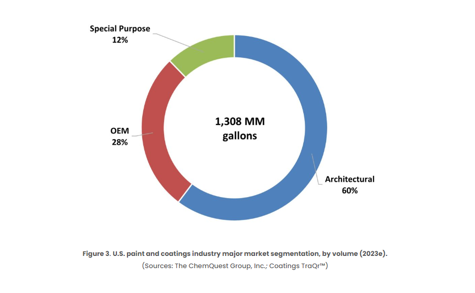 The sure sign of a solid coatings industry lies in the strength of the housing/construction market. The architectural paints sector accounts for 60% of the volume within the U.S. coatings industry and is expected to finish 2023 with a slight 1% increase. Looking forward to 2024, growth is anticipated to be 3% (ChemQuest).