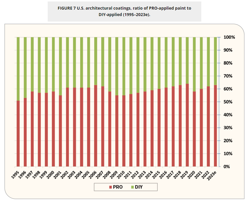 Side note: PRO vs. DIY — When it comes to home painting projects, the balance between professionals and do-it-yourselfers has tilted back and forth for years. This changed significantly, thanks to COVID-19. Case in point: From 2010 to 2019, professional work was steadily growing, yet it dropped in 2020, as homebound DIYers used this time to freshen up their spaces. From 2021 to 2023 professional work rebounded strongly, with a 2023 ratio of 63% professional to 37% do it-yourselfer, which was driven by a resurgent commercial building sector balancing out a weaker residential sector (Coatings Tech Magazine).