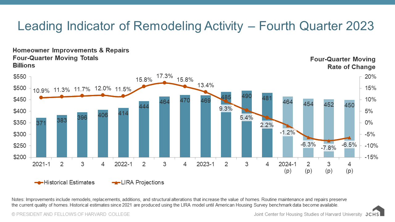 While the renovation sector has been strong for a number of years, interest rates combined with low housing inventory is expected to weigh on remodeling activity, which is estimated to decline by 6.5% (from $481 billion in 2023 to $450 billion in 2024), according to the Leading Indicator of Remodeling Activity (LIRA).