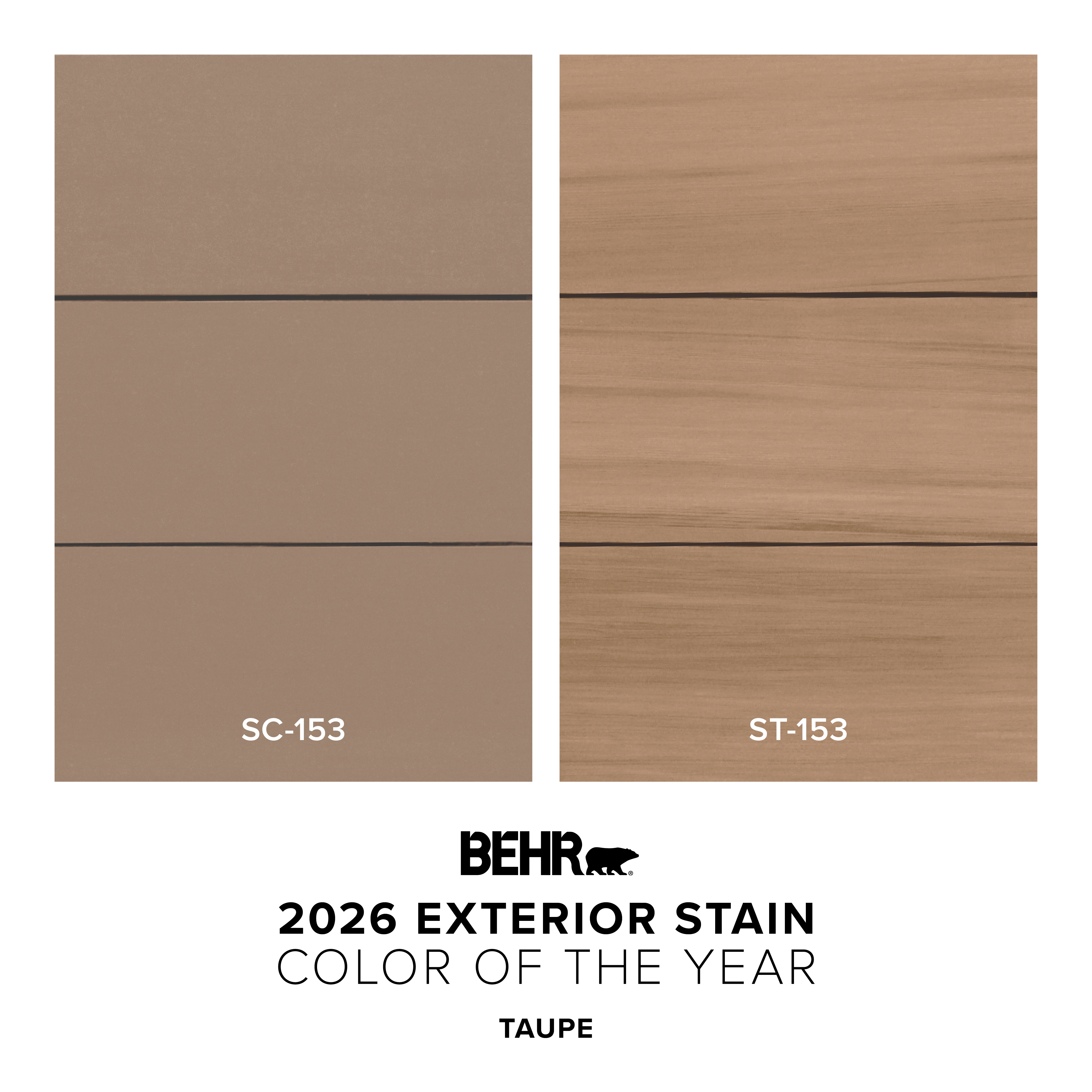 The 2026 Exterior Stain Color of the Year and Outdoor Accent Color Collection is available exclusively at The Home Depot. Consumers can find Taupe in a variety of BEHR® products, including the #1 rated exterior stain, according to a leading independent consumer publication, BEHR PREMIUM® Solid Color Waterproofing Stain & Sealer. The color is also available in BEHR PREMIUM® Semi-Transparent Waterproofing Stain & Sealer, BEHR® DECKplus Waterproofing Wood Stain, BEHR® Solid Color House & Fence Wood Stain, and BEHR PREMIUM® ADVANCED DECKOVER®.