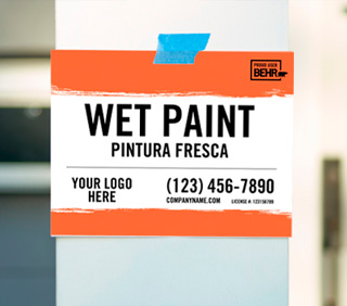 Protect your work with wet paint signs. Display them prominently around the work area to keep passersby from accidentally touching freshly painted walls, floors, doors, or fences. In addition to informing the world your most recent masterpiece is still wet, these co-branded signs act as a signature, telling everyone who to contact for their next paint project. Wet paint signs are available in various colors to complement your other branded items.