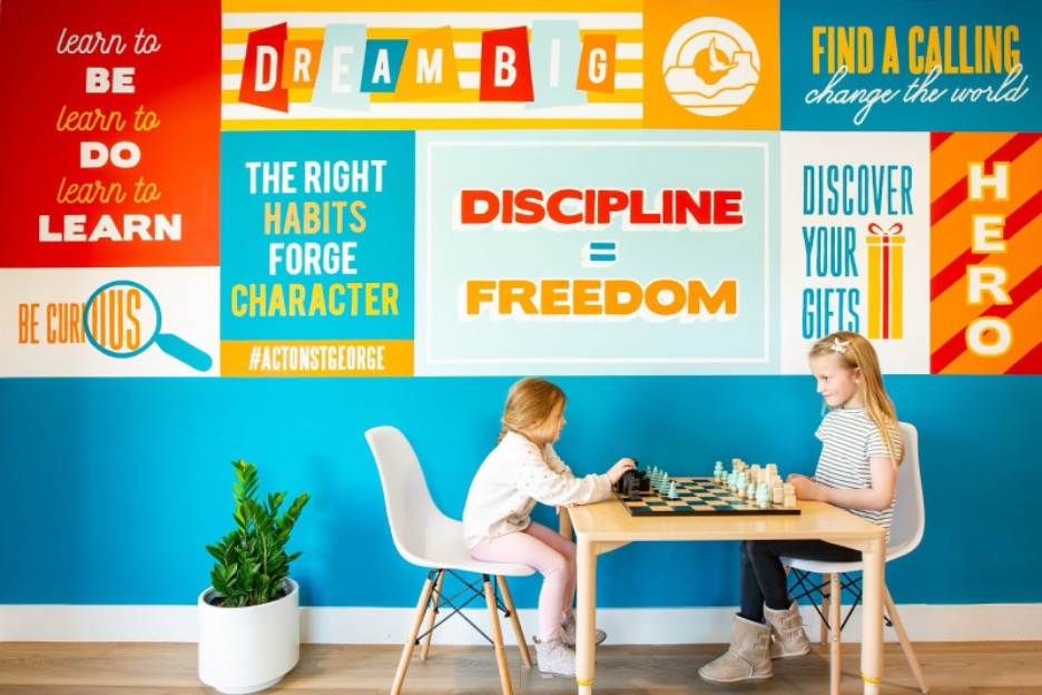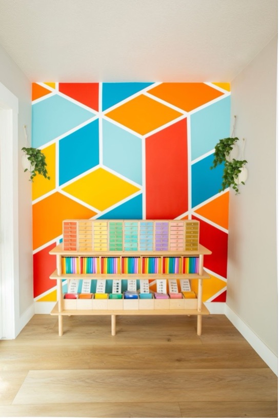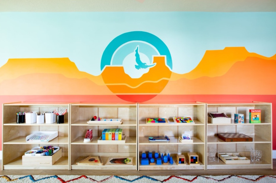 Seeing the buzz at NeoCon reminded me of our own projects where Behr has played a role. At Acton Academy, we designed and executed three murals using Behr colors. One featured a bold logo wall that greets students every morning, another was a geometric patterned mural, and the last was a quote wall that inspires curiosity and learning. These murals were brought to life by local muralist Tiffany Dewitt from Color Brush Co, and her artistry paired perfectly with Behr’s vibrant and durable paint selections.