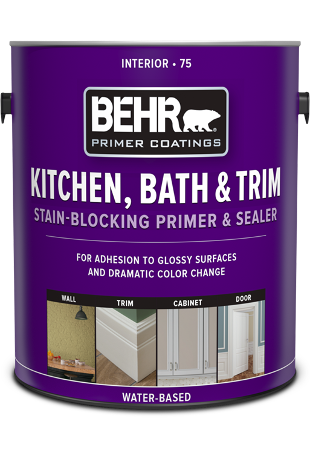 Choose a primer that is formulated for your specific situation. For instance, if you are painting enamel over previously painted cabinets, “our BEHR® Kitchen, Bath & Trim Stain-Blocking Primer & Sealer will do the trick,” says Edrosa. This primer blocks medium-to-heavy stains and is perfect for properly prepped glossy surfaces.