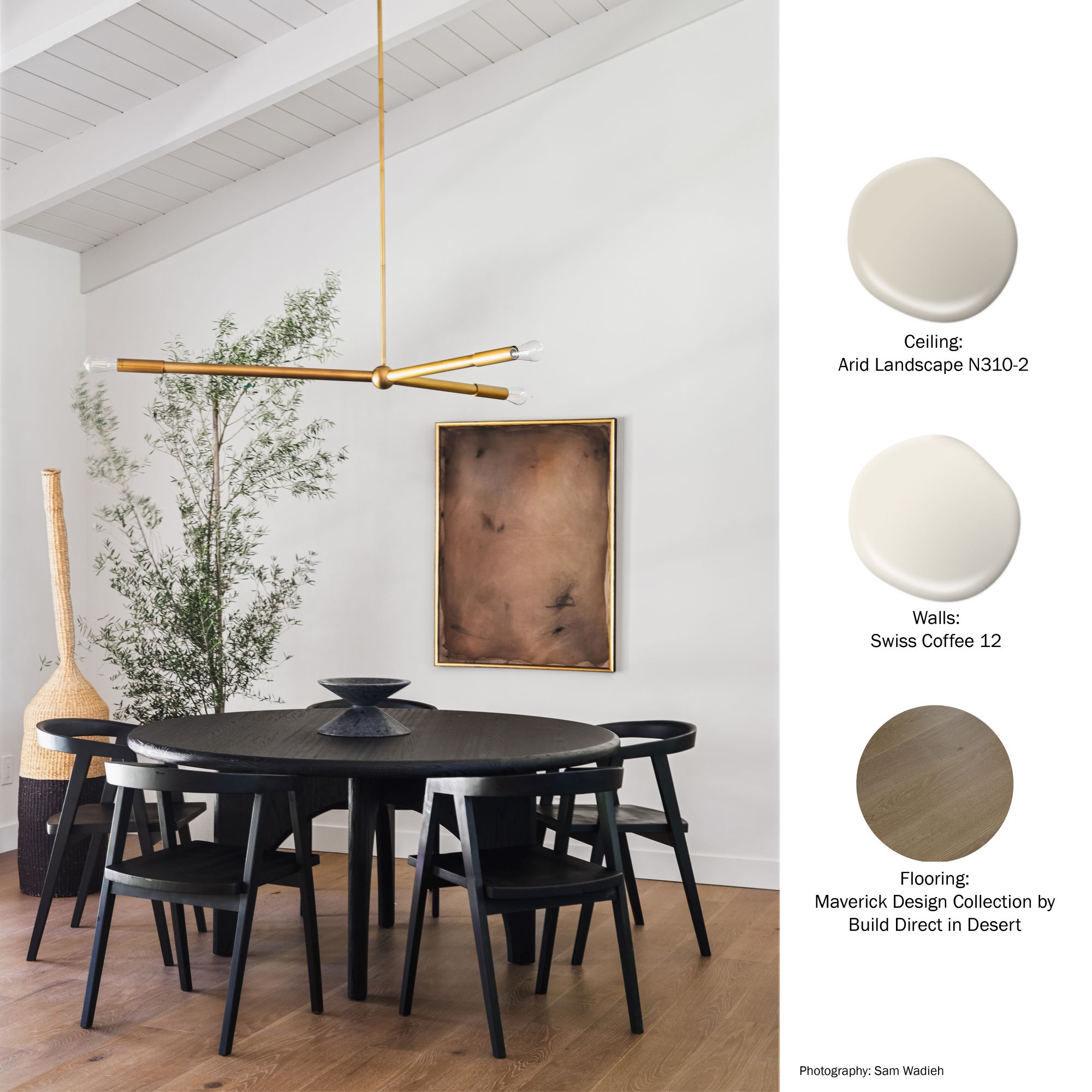 Swiss Coffee is the perfect soft and subtle white that adds warmth and dimension to interior spaces. It has a greige undertone that adds a touch of sophistication for an elevated but cozy aesthetic.