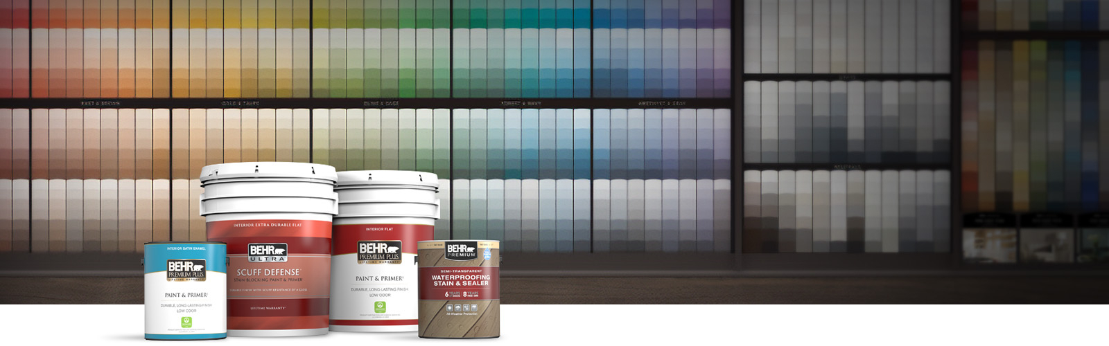 Paint Cans in front of  the BEHR Color Center BEHR Paint  and Stain Cans in front of  the BEHR Color Center