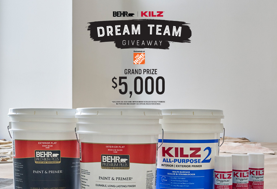 Enter for a chance to win up to $5,000 from the Dream Team. BEHR® Paint & KILZ® Primer, now available together exclusively at The Home Depot*, are teaming up to bring you one of three chances to score big.